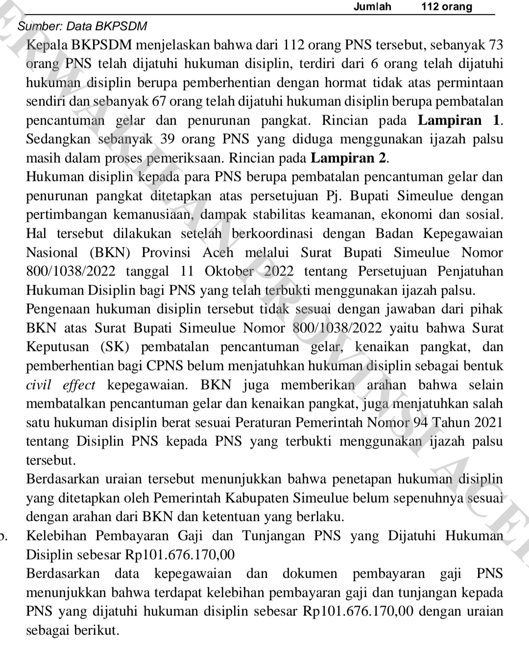 Kasus Ijazah Palsu ini menjadi perhatian publik setelah munculnya temuan Badan Pemeriksa Keuangan (BPK) Tahun 2022. Dan anehnya dalam LHP BPK juga disebutkan Pejabat Bupati Simeulue, Ahmadlyah, tidak menjalankan arahan Badan Kepegawain Nasional (BKN) agar menjatuhi hukum displin berat kepada PNS yang terindikasi berijazah Palsu.