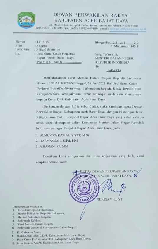 Dalam surat itu, DPRK Abdya mengusulkan tiga nama calon Pj Bupati Aceh Barat Daya periode 2023-2024 kepada Mendagri, masing-masing yaitu Almuniza Kamal, S.STP, M.Si, Darmansah SPd, MM, dan A. Hanan S.P, MM.